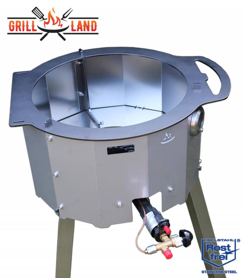 Der Grill-Land GLTG-38S Feuerofen Utschak ist ein tragbares Gerät der mit der Benutzung eines Hockerkochers zum Erhitzen und Zubereiten von Speisen und Getränken dient. Die Konstruktion des GLTG-38S Feuerofen Utschak sieht die Verwendung von Wok- oder Kessel - Kazan aus Aluminium, Stahl oder Gusseisen mit einem Sitzdurchmesser von 385 mm bis 450 mm vor, was in etwa einem Innenvolumen von 10 bis 17 Litern entspricht.