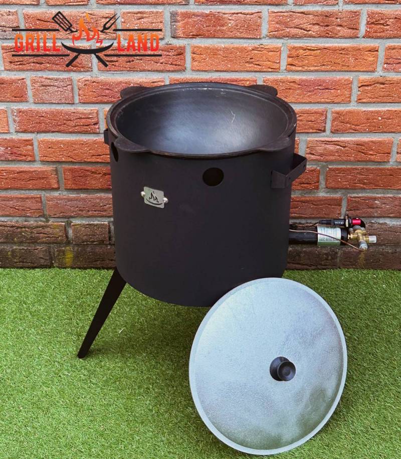 SET Gas-Feuerofen Utschak KOMFORT 37 cm, Stahl 3mm, mit 10L Kazan Usbekisch, aus Gusseisen mit Aludeckel, Boden rund