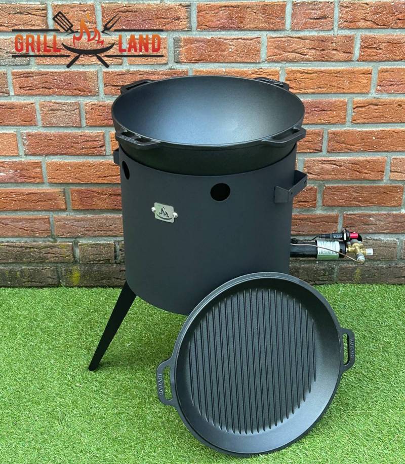 SET Gas-Feuerofen Utschak KOMFORT 37 cm, Stahl 3mm, mit 12 Liter Kazan Gusseisen Robari mit Grillpfannendeckel aus Gusseisen
