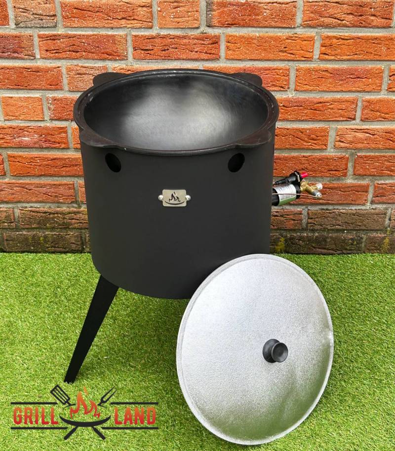 Feuerofen KOMFORT 40 cm, 3-Fuß Hockerkocher, 3 Adapter für Hockerkocher, 12L Kazan Usbekisch, aus Gusseisen mit Aludeckel, Boden flach.